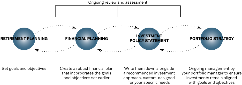 We believe that retirement planning begins at goal setting. Once goals have been determined, they are integrated with your financial information to create a financial plan. Then an investment strategy is developed and presented to you in a written and easy-to-read Investment Policy Statement, an important document that outlines the recommended portfolio strategy.
