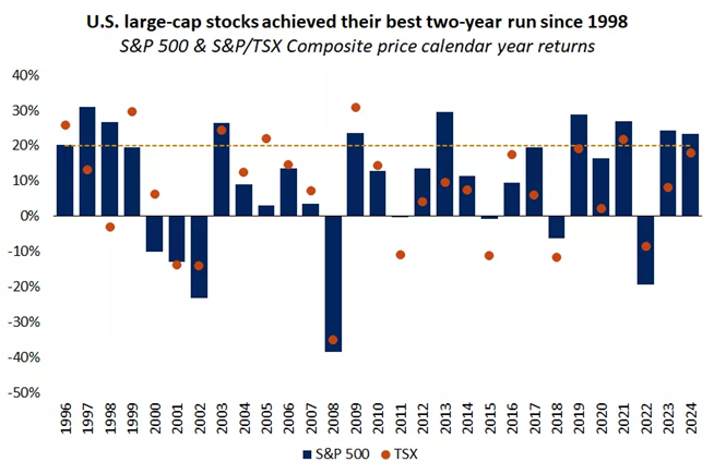 With the holidays and new year celebrations done, stock markets in the United States (U.S.) and Canada got back to business and rebounded last Friday from the underwhelming end to 2024. That said, 2024 was a good year for investors in the U.S. and Canada. Noticeably, it was the second year in a row that U.S. large-cap stocks achieved solid returns.