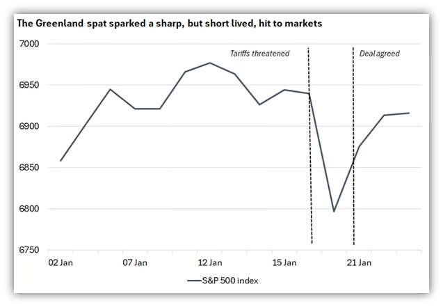 U.S. markets were closed last Monday in observance of Martin Luther King Jr. Day. What followed was a volatile, holiday-shortened week for U.S. markets, which all finished the week lower. As geopolitics again became a focus, stocks traded sharply lower on Tuesday, with the S&P 500 Index posting its largest daily decline since October, amid renewed fears of a global trade war after President Donald Trump announced that he would impose new tariffs on European nations that opposed the U.S. purchasing or otherwise taking control of Greenland. However, these markets reversed course on Wednesday after Trump softened his stance and stated that he would no longer be imposing the tariffs scheduled to go into effect at the beginning of February. U.S. stocks rallied on the news, ultimately finishing the week above their worst levels.